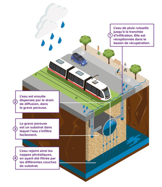 L’agence de l’eau Rhône Méditerranée Corse, a accompagné le projet de désimperméabilisation des sols sur le nouveau tracé. Laisser l’eau couler là où elle tombe permet d’éviter le débordement des réseaux d’assainissement, source de pollution des réserves d’eau souterraines et des rivières. En complément, végétaliser les sols permet de faire des économies en évitant le traitement de l’eau par les stations d’épuration.