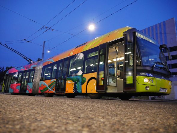 Pour l’occasion, un trolleybus a été entièrement peint à la bombe par l’artiste lyonnais Kalouf : une fresque animale très colorée anime désormais la ligne et la ville !