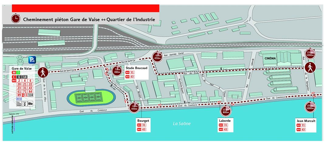 Depuis le début du mois de septembre, le SYTRAL expérimente une signalétique piéton pour les clients du réseau qui arrivent à la station Gare de Vaise et se rendent dans les entreprises du quartier de l’industrie.