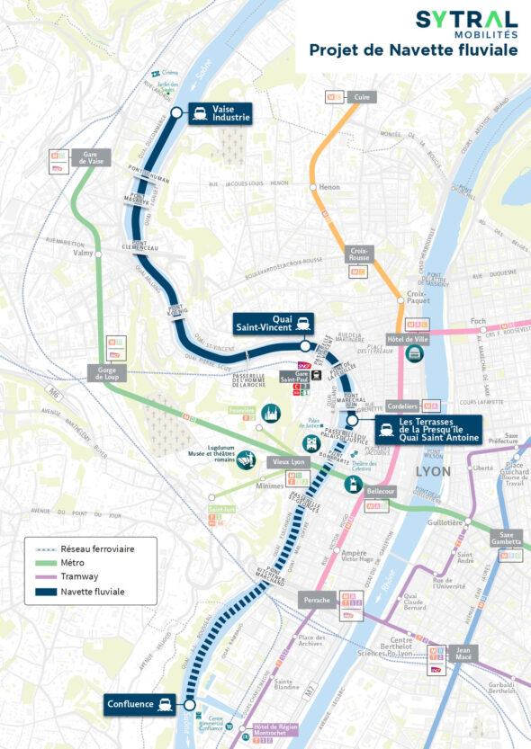 Les élus de SYTRAL Mobilités ont approuvé la création d’une première ligne de transport en commun fluvial sur la Saône entre le quartier de l’Industrie (9ème arrondissement de Lyon) et les quartiers de la Presqu’île (deuxième arrondissement de Lyon). Des haltes seront créées dans le 1er arrondissement, (en bas des pentes de la Croix-Rousse quai Saint Vincent) et quai Saint Antoine, dans le cadre du projet « Terrasses de la Presqu’ile » portée par la Métropole de Lyon, entre la rue Grenette et la passerelle du palais de justice