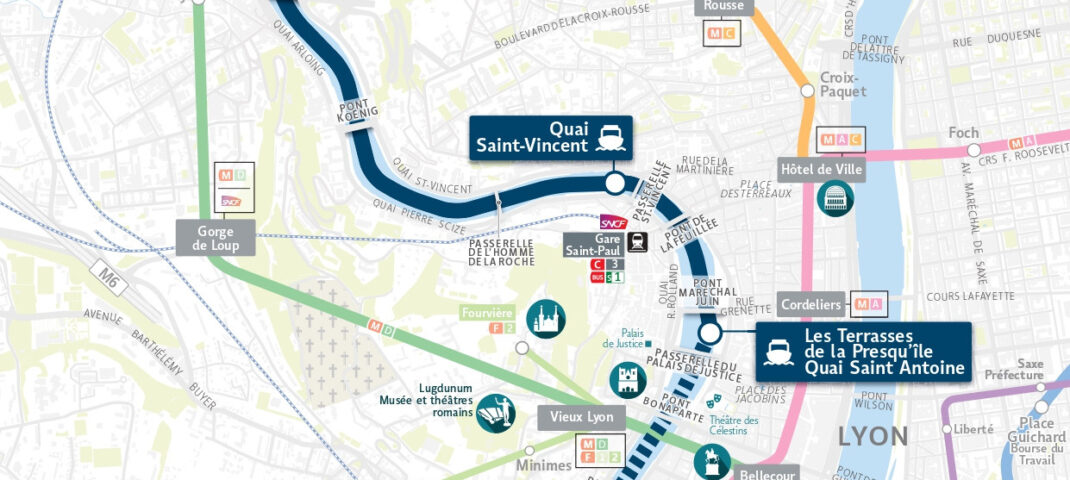 Les élus de SYTRAL Mobilités ont approuvé la création d’une première ligne de transport en commun fluvial sur la Saône entre le quartier de l’Industrie (9ème arrondissement de Lyon) et les quartiers de la Presqu’île (deuxième arrondissement de Lyon). Des haltes seront créées dans le 1er arrondissement, (en bas des pentes de la Croix-Rousse quai Saint Vincent) et quai Saint Antoine, dans le cadre du projet « Terrasses de la Presqu’ile » portée par la Métropole de Lyon, entre la rue Grenette et la passerelle du palais de justice