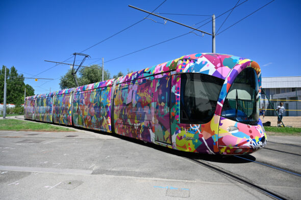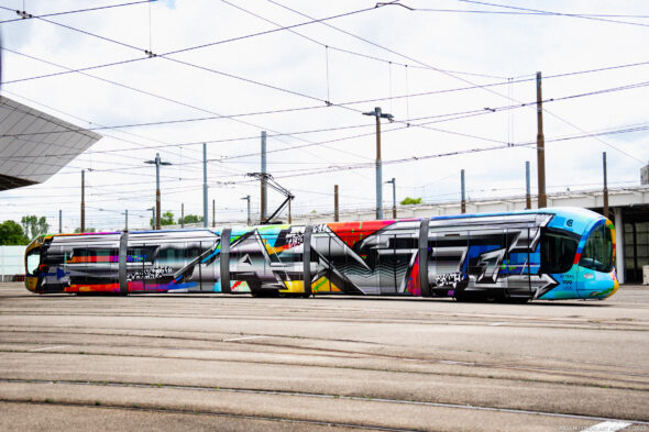 Depuis quelques semaines, une neuvième rame de tram, habillée par le peintre et sculpteur espagnol Okuda, circule sur le réseau.