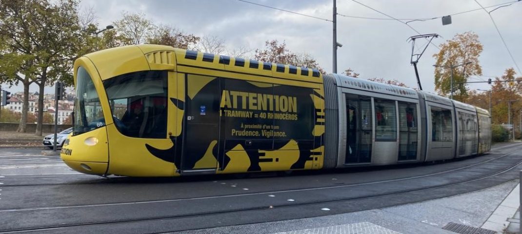 Souvenez-vous qu’en cas de collision, un tramway c’est le poids de 40 rhinocéros… Cela mérite bien une campagne choc ! Le SYTRAL mène par ailleurs des expérimentations pour diminuer les accidents.