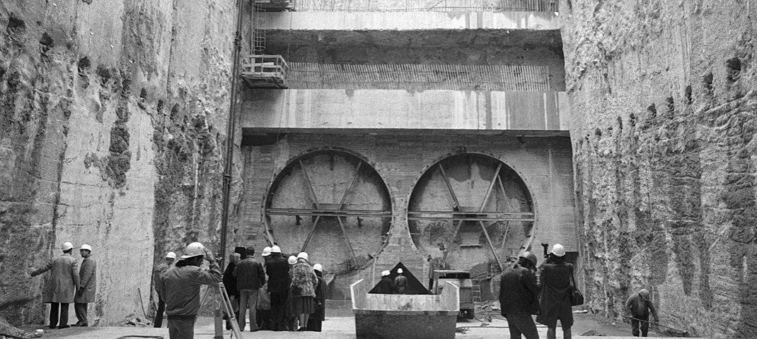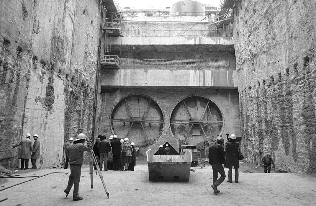 Les tunnels de la ligne D sont réalisés grâce à un tunnelier également appelé « la taupe ». Ici, visite de chantier à la fosse aux ours en 1985.