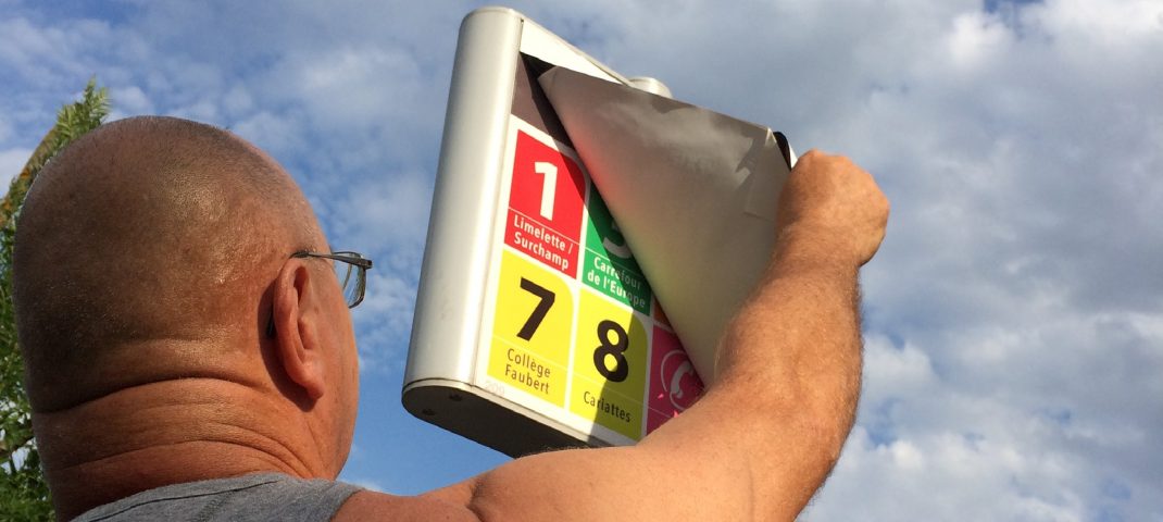 Nouvelle signalétique pour les arrêts plutôt inattendue… Mais très bien faite, très »design » et encore jamais vraiment vue. Si on a l’oeuil, on remarque que les n° de lignes sont encadrés par le même carré que celui du logo sytral ! ;)