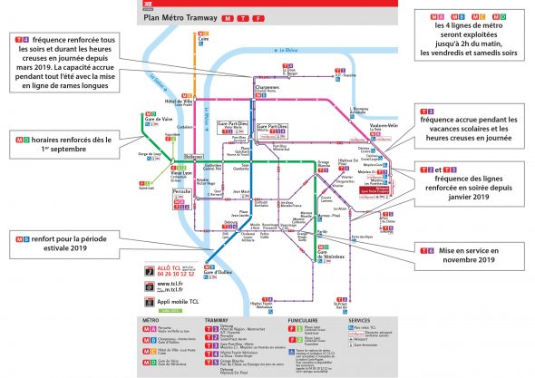 Le SYTRAL finance ces renforts d’offre à hauteur de plus de 6 M€. Ci-dessous les lignes de métros et de tramways…