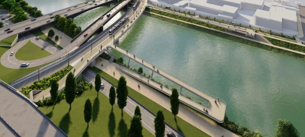 La création de la ligne T9 s’accompagne de la construction d’un nouvel ouvrage d’art et de soutènement pour franchir le Canal de Jonage à Villeurbanne et relier les quartiers de Saint-Jean et Croix-Luizet. Insérée en parallèle du pont du Roulet, la nouvelle infrastructure accueillera le tramway, les cycles et les piétons.