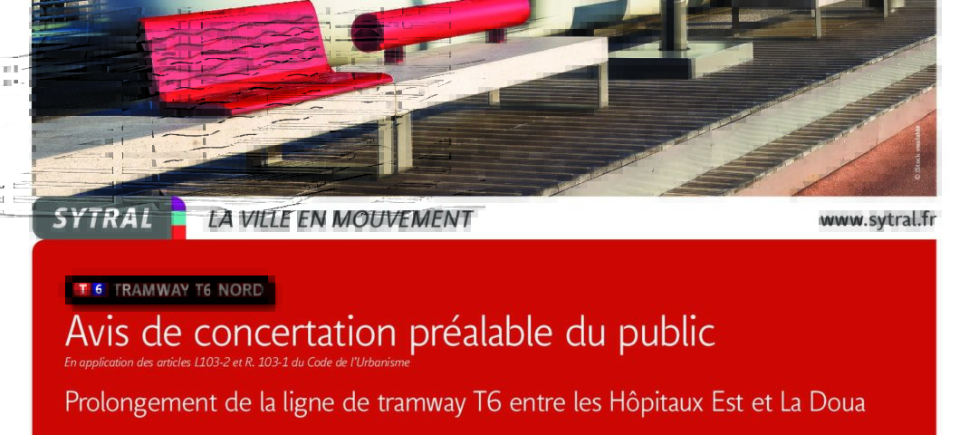 Le prolongement de T6 vers le Nord (jusqu’à la Doua) entre dans la phase de concertation, du 2 mai au 14 juin 2019. L’ensemble des éléments sont contenus dans le dossier de concertation qui est disponible en mairies (Lyon 3, Villeurbanne, Bron) mais aussi à la Métropole de Lyon et au SYTRAL (au siège et sur le site internet sytral.fr).