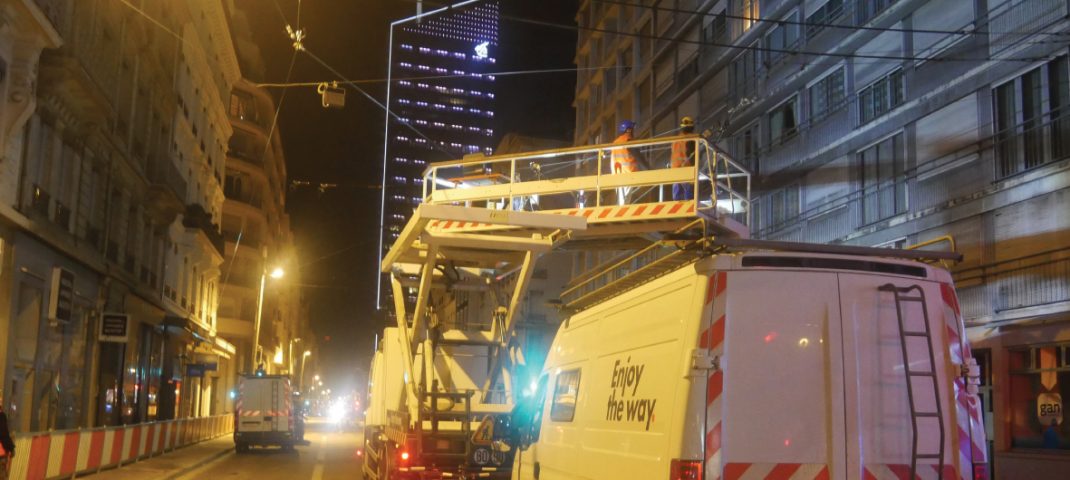 Depuis fin février, une opération particulière se déroule entre 22h30 et 5h du matin. Il s’agit de déposer l’ancienne ligne aérienne de contact (la « LAC » dans le jargon) des trolleybus. Cette ligne électrique qui permet l’alimentation des véhicules sera intégralement démontée d’ici l’été avant qu’une nouvelle ligne, remise aux normes, soit installée courant 2018.