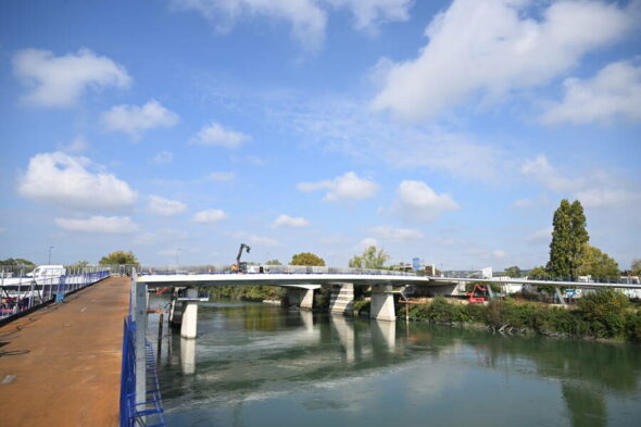 Maintenant que le nouveau pont repose sur ses appuis définitifs, place aux travaux d’aménagements : gardes corps, tiges de béton fibré, rampes d’accès aux berges etc. !