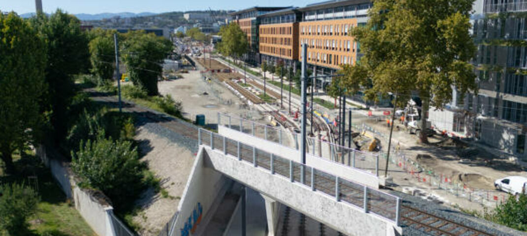 Il y a un an, une trémie a été installée sous une voie ferrée dans le secteur du Port Édouard Herriot. Aujourd’hui, l’ouvrage a bien avancé, les réseaux ont été déviés, la plateforme du tramway prend place, les rails ont été posés et soudés, les poteaux des lignes aériennes installés, et les aménagements cycles et piétons sont en cours de finalisation.